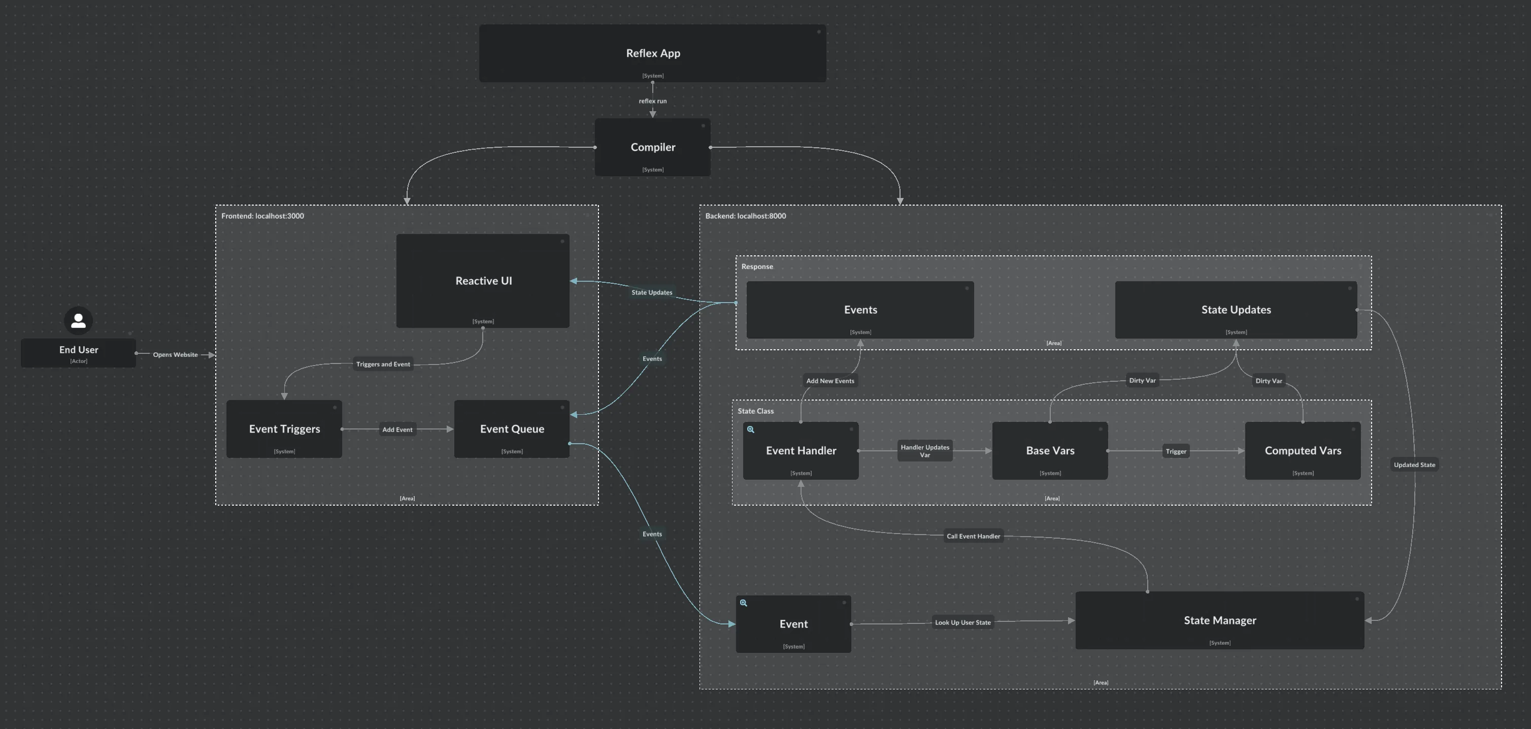 The diagram below provides a detailed overview of how a Reflex app works. We'll go through each part in more detail in the following sections.