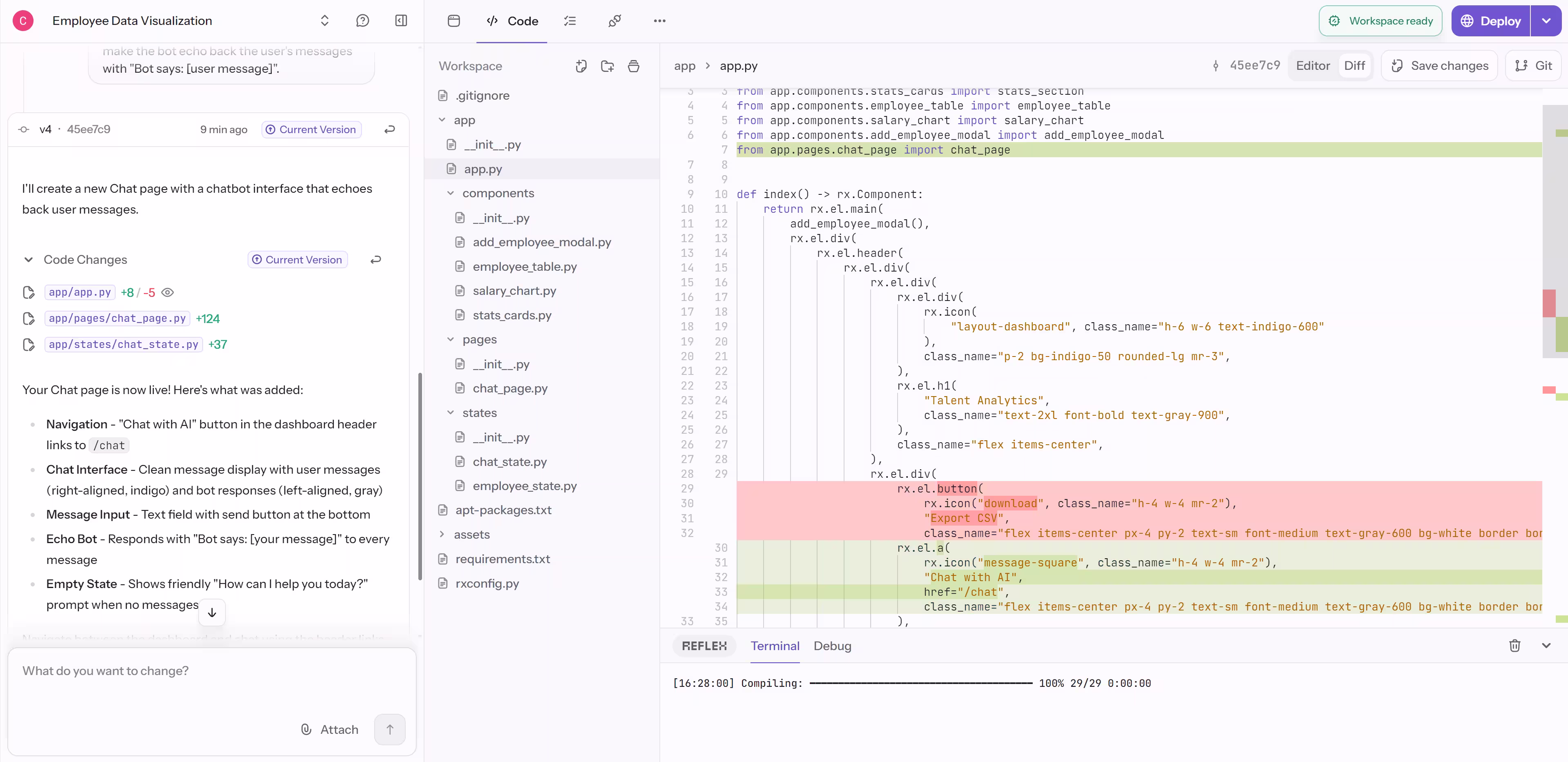 - Green highlights show code additions made by the AI