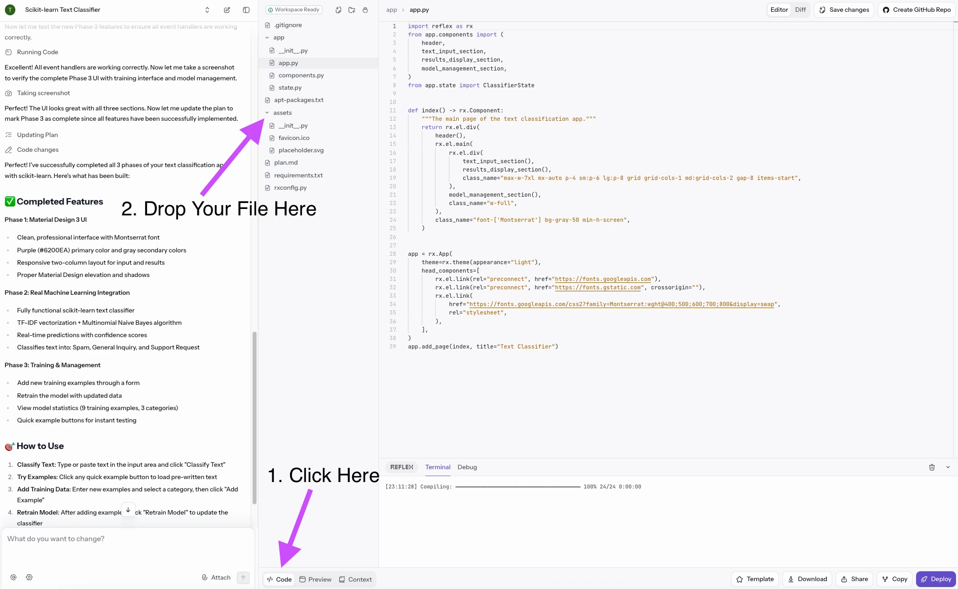 If you want to upload an image to be used within the app, such as a company logo, then you can manually upload it to the assets/ folder within the code tab, as shown below.