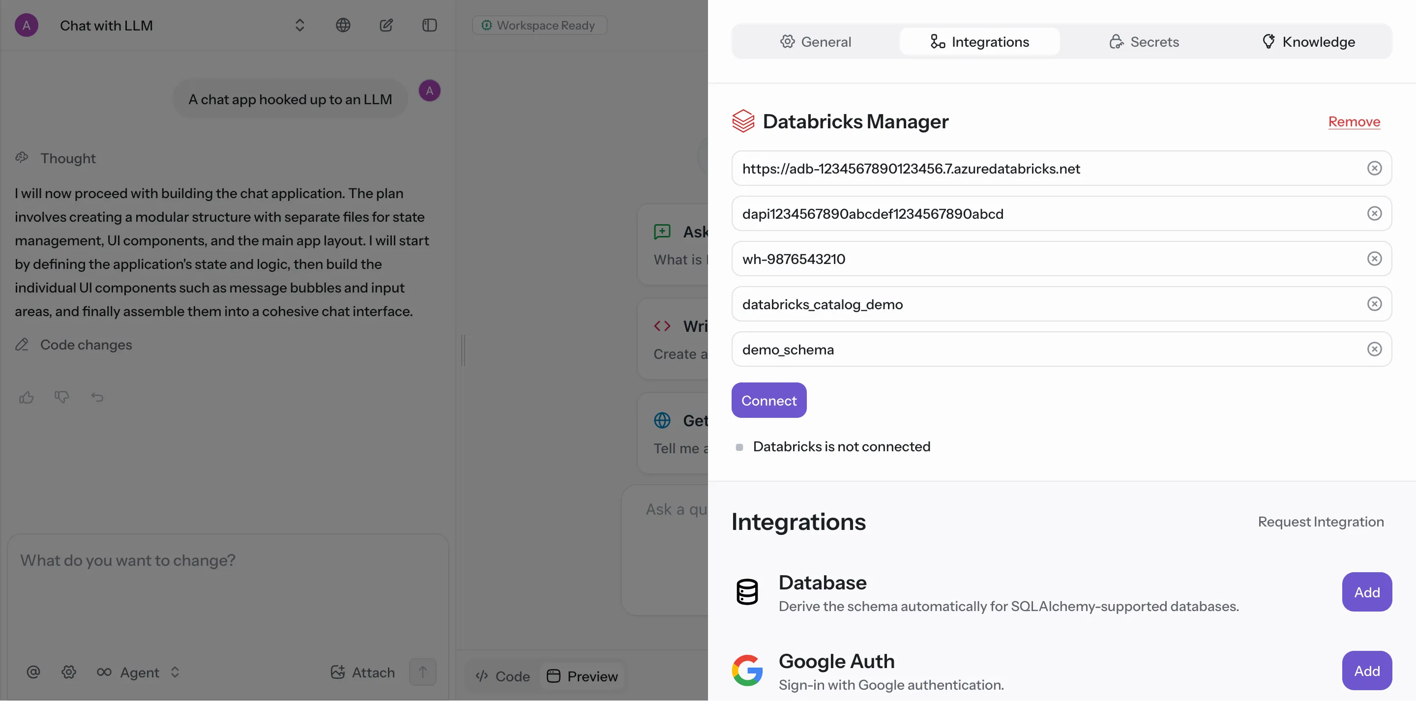 The Databricks Integration allows your app to connect to a Databricks workspace, query data from warehouses, and use catalogs and schemas directly in your app. This integration supports secure authentication via tokens and can be configured per environment.