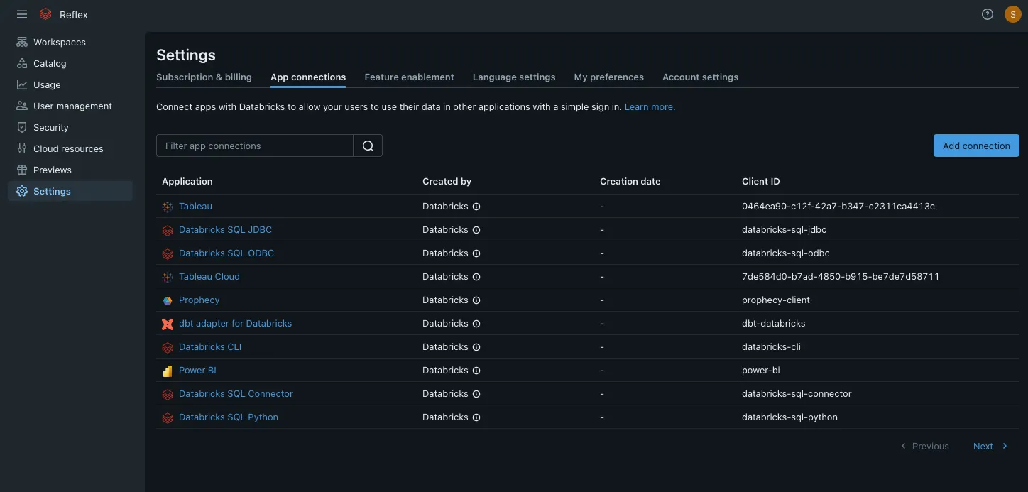 - Connect securely to your Databricks workspace.