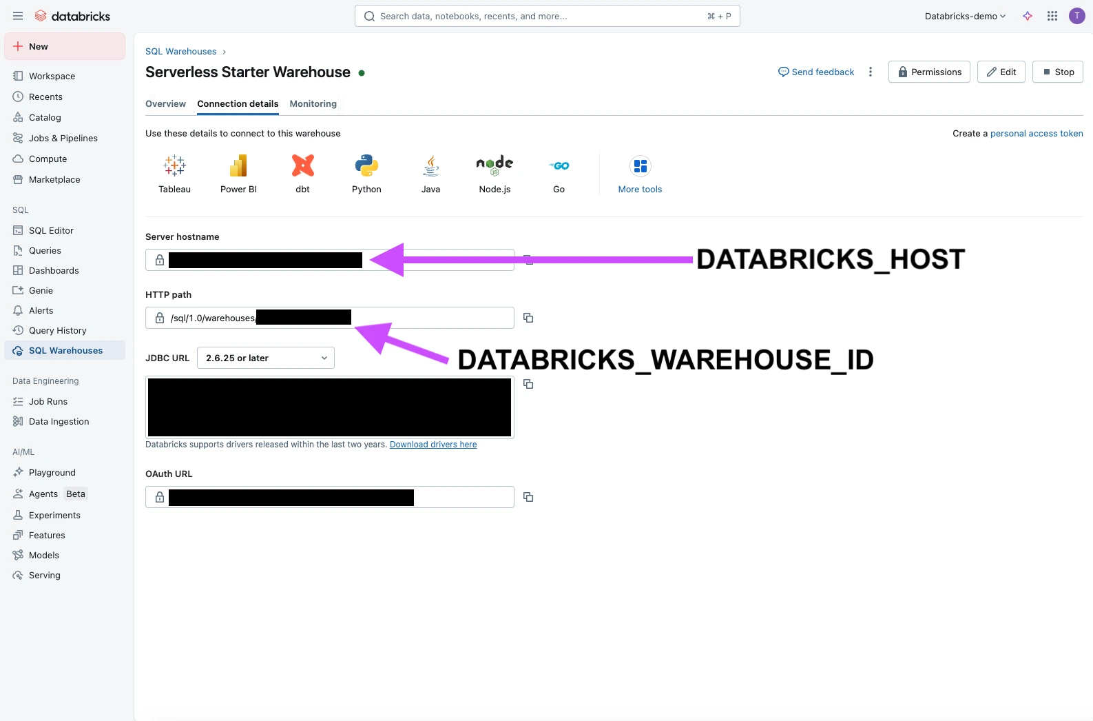 2 - Get your DATABRICKS_HOST and DATABRICKS_WAREHOUSE_ID:
