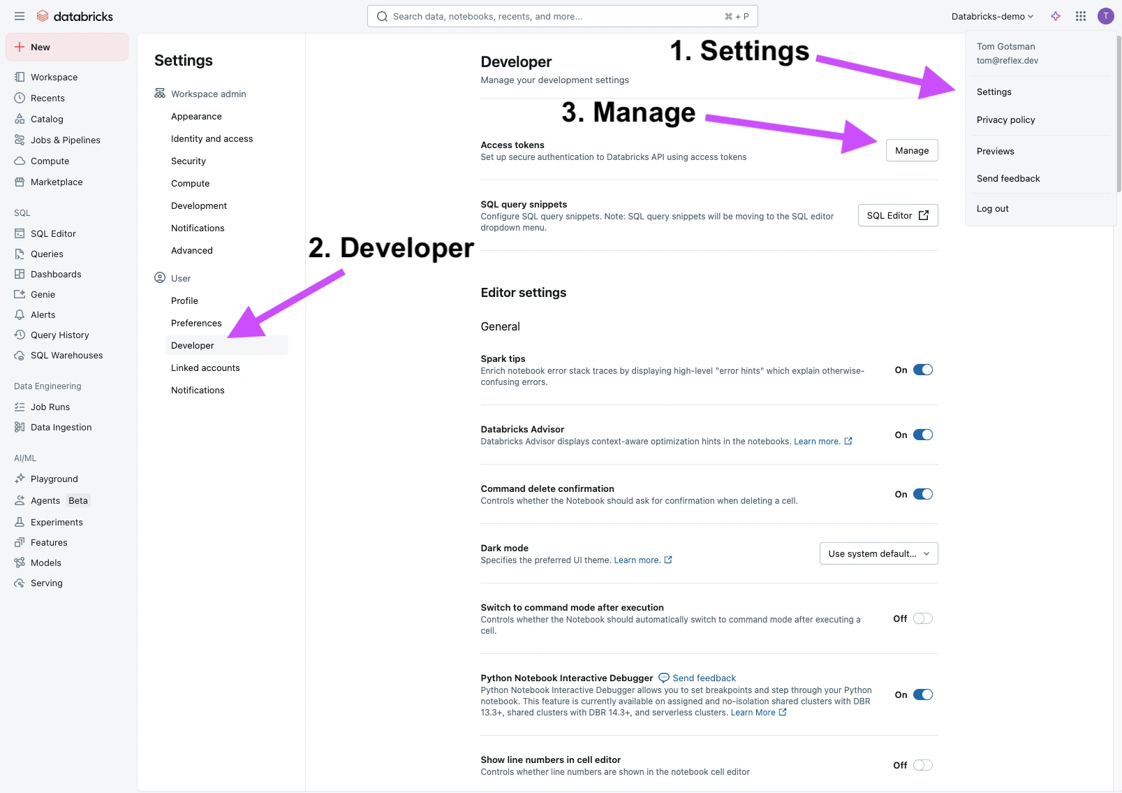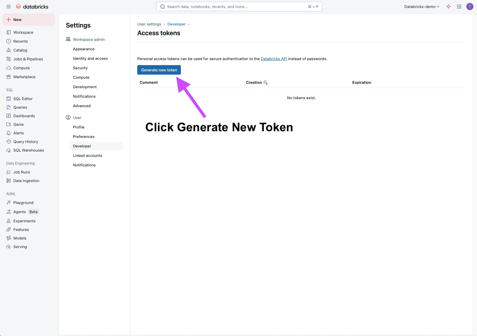- Click Generate New Token, provide a name and expiration, then copy it (DATABRICKS_TOKEN).