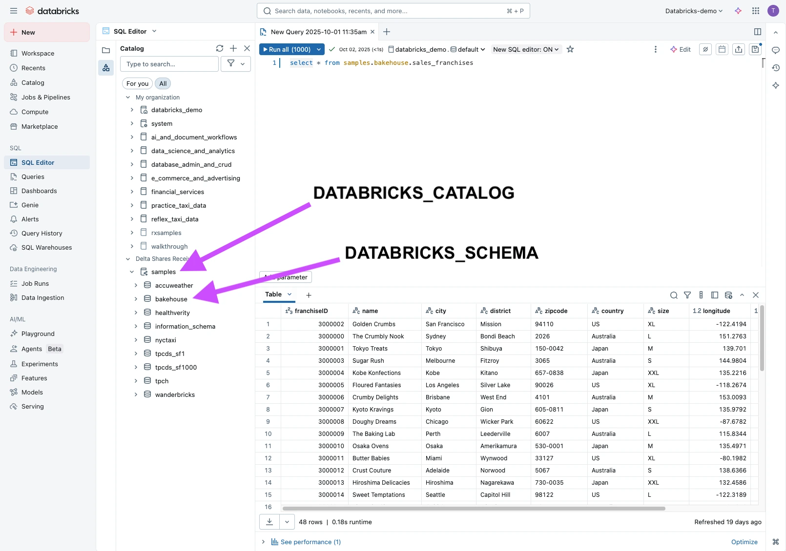 3 - Get your DATABRICKS_CATALOG and DATABRICKS_SCHEMA: