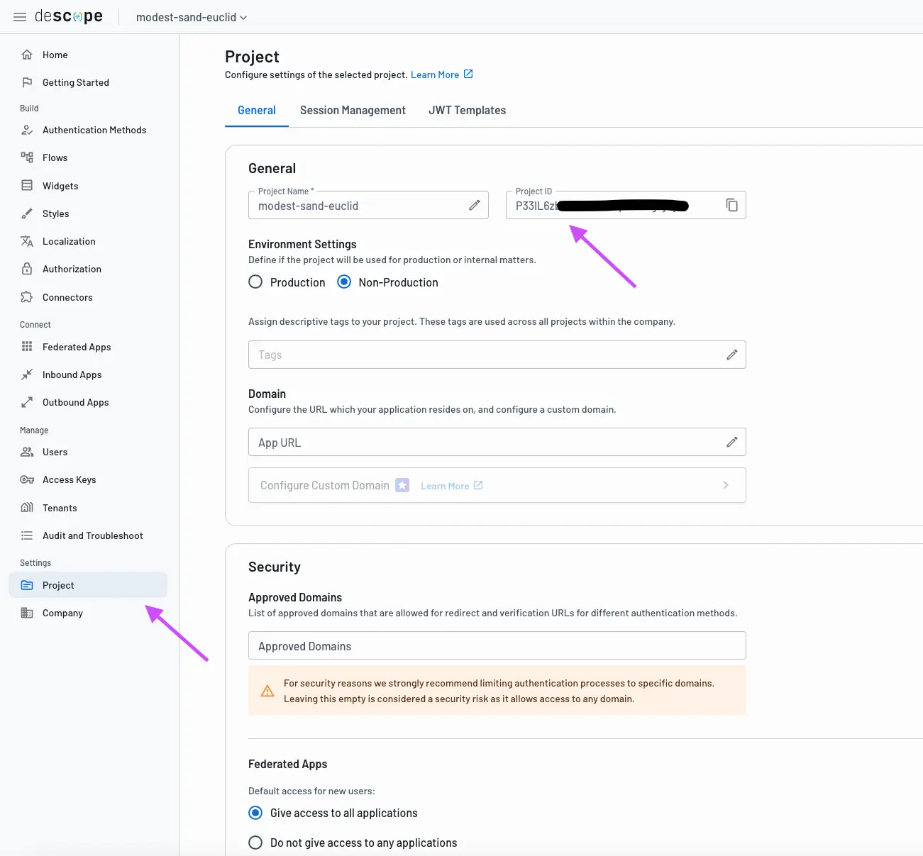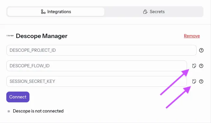 - (Optional) Pick a DESCOPE_FLOW_ID (e.g. “sign-up-or-login”) and SESSION_SECRET_KEY or press the Clipboard Copy to use default values.