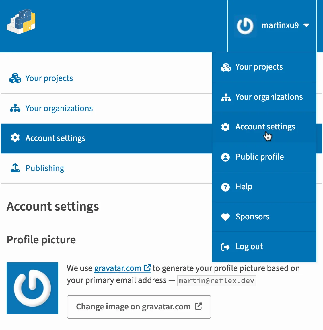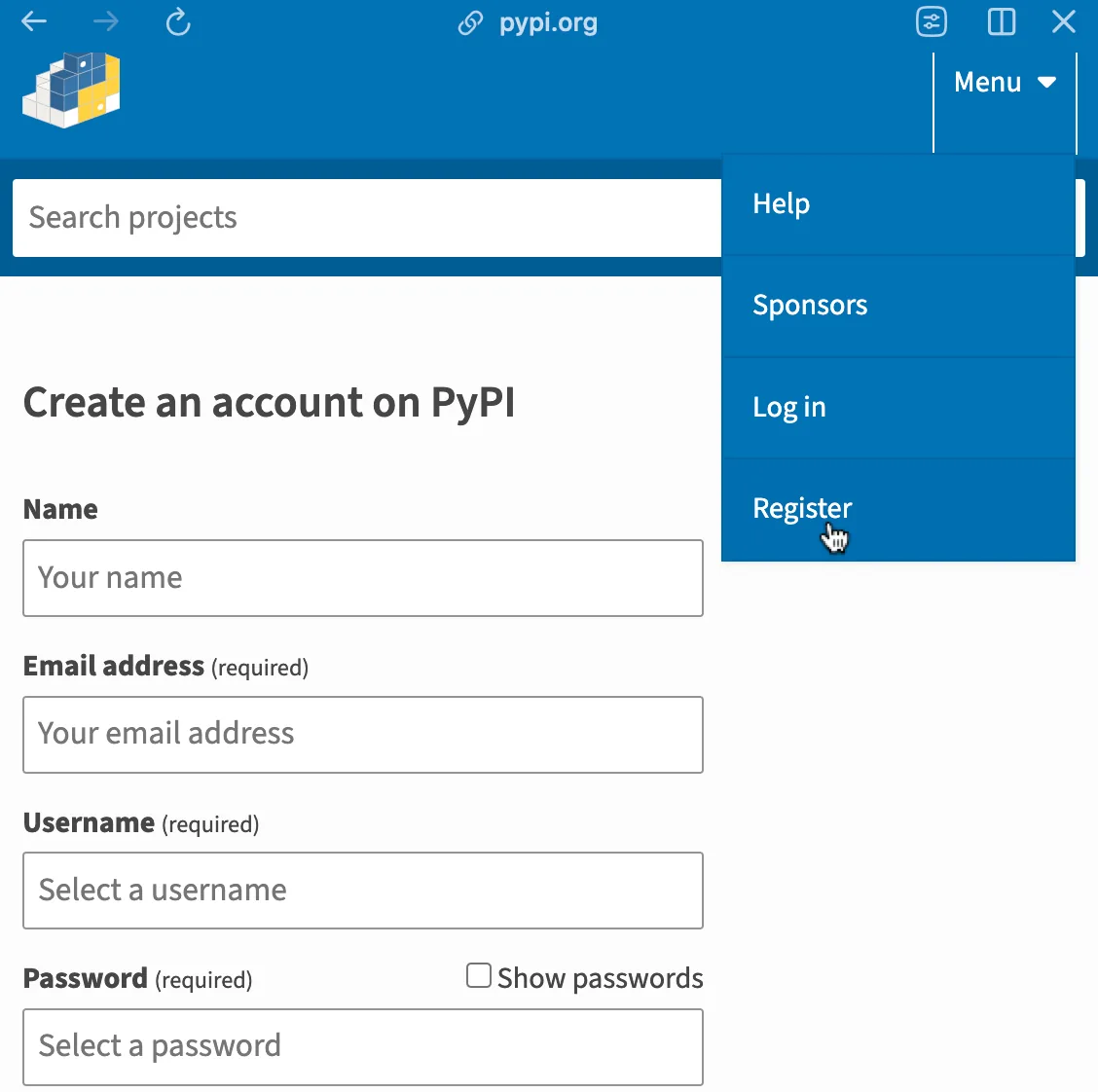 It is straightforward to create accounts and API tokens with PyPI. There is official help on the PyPI website. For a quick reference here, go to the top right corner of the PyPI website and look for the button to register and fill out personal information.